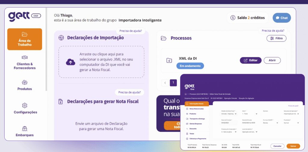 A emissão da NF-e via Gett One passa a fazer parte de um fluxo único dentro do sistema, de forma a permitir que a equipe do despachante aduaneiro acompanhe tudo em uma única plataforma, com identificação rápida das importações, status das notas fiscais e histórico por cliente.