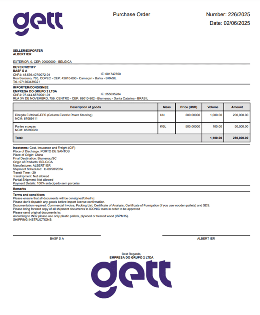 Veja um exemplo de uma PO gerada em um clique através do software para importadores, Gett Pro: