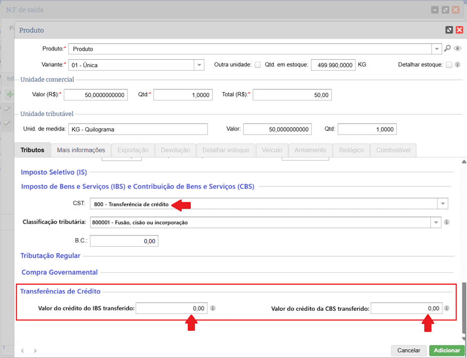Quando selecionado um CST que exige o preenchimento dos dados de Transferência de crédito, por exemplo: