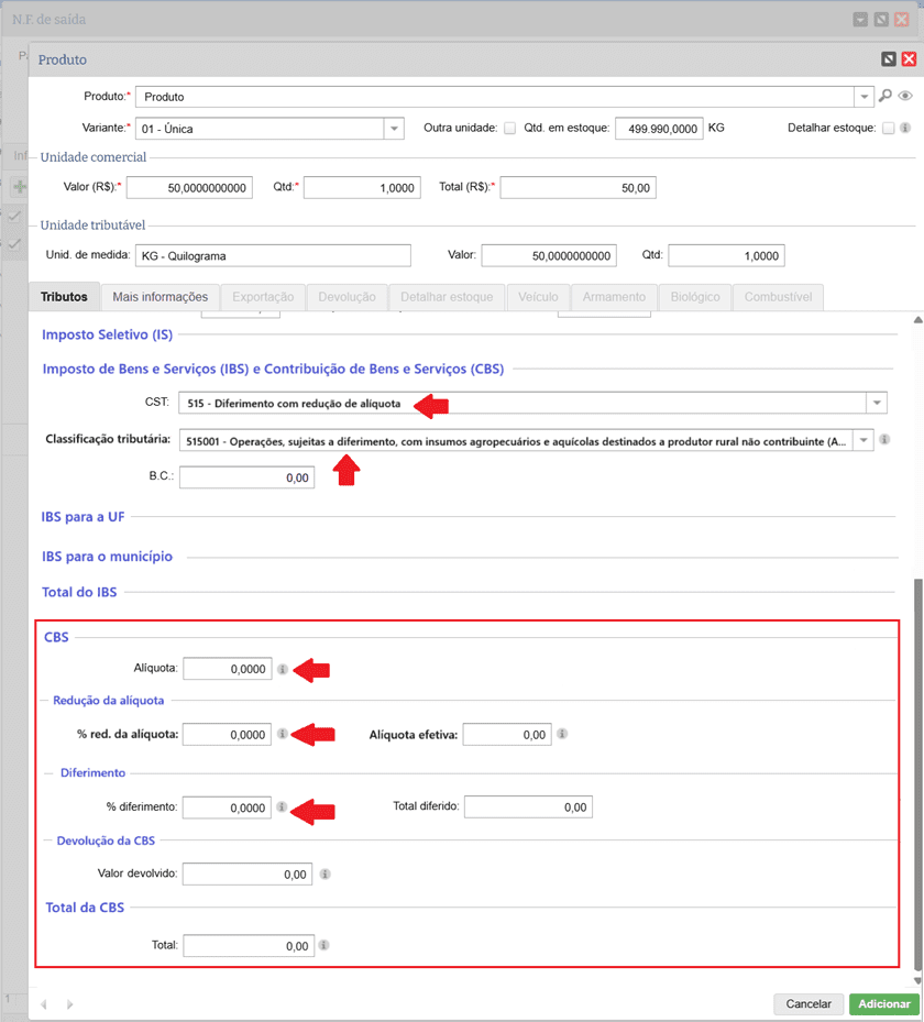Quando o CST informado exige o preenchimento dos dados de Redução da alíquota (exemplos: 200 e 515), haverá na CBS o campo % red. da alíquota para informar o valor percentual de redução a ser aplicado na alíquota padrão, calculando assim a Alíquota efetiva.