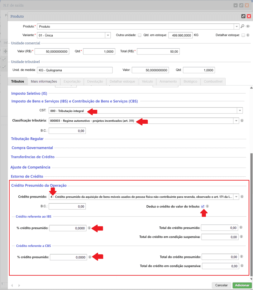 Quando selecionado um CST e uma Classificação tributária que permite o preenchimento dos dados de Crédito Presumido da Operação, poderá ser informado qual é o Crédito Presumido (cCredPress) e os valores quando aproveitado pelo Emitente da NF-e, visto que não há a obrigatoriedade de preenchimento. Exemplo: