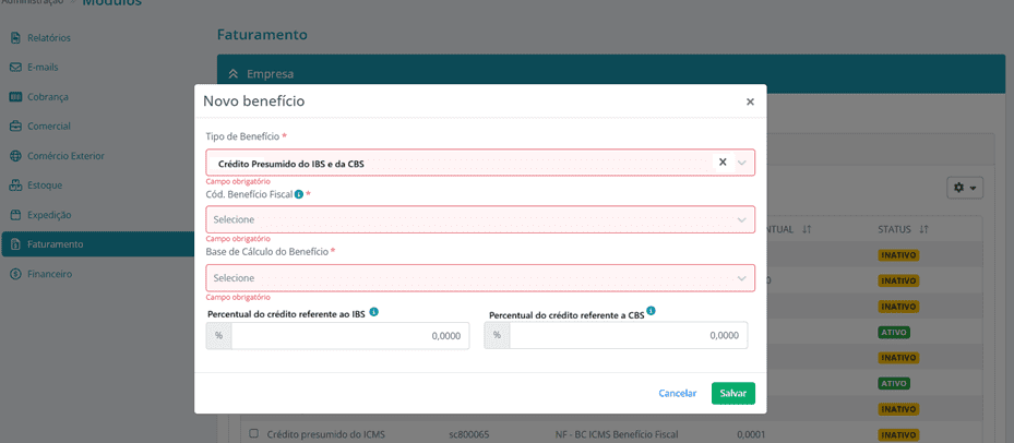 Da mesma forma que o Crédito Presumido do ICMS pode ser parametrizado por Empresa Emitente nas Configurações do Faturamento, o Crédito Presumido do IBS e da CBS também poderá: