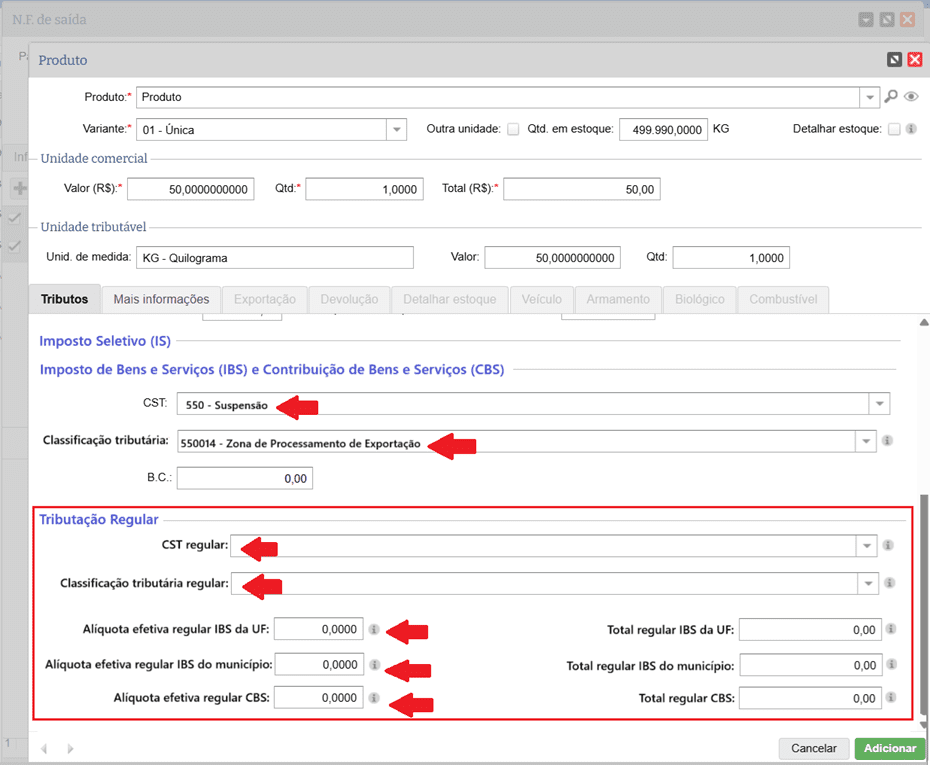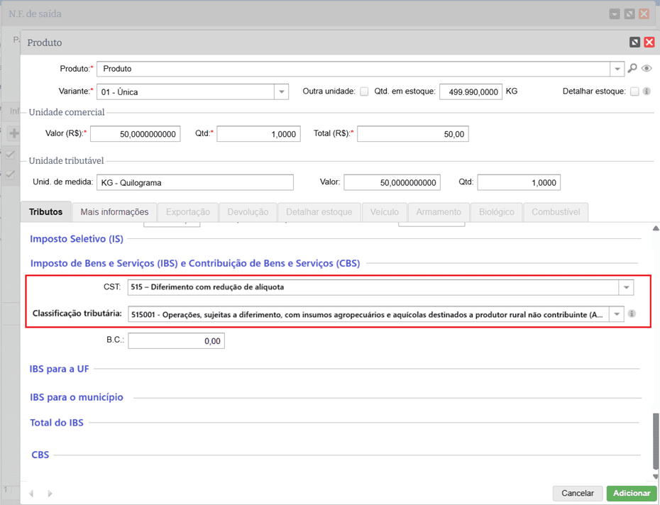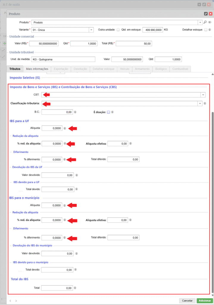 Quando selecionado um CST e uma Classificação tributária que exige o preenchimento dos dados de Tributação regular do IBS e CBS, por exemplo: