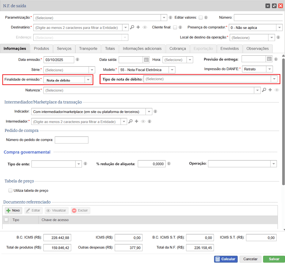 Para que seja possível utilizar a finalidade “Nota de débito” é obrigatório informar o “Tipo de nota de débito”: