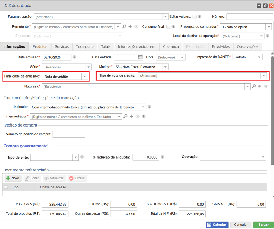 No momento em que utiliza-se a finalidade “Nota de crédito”, é obrigatório informar o “Tipo de nota de crédito”: